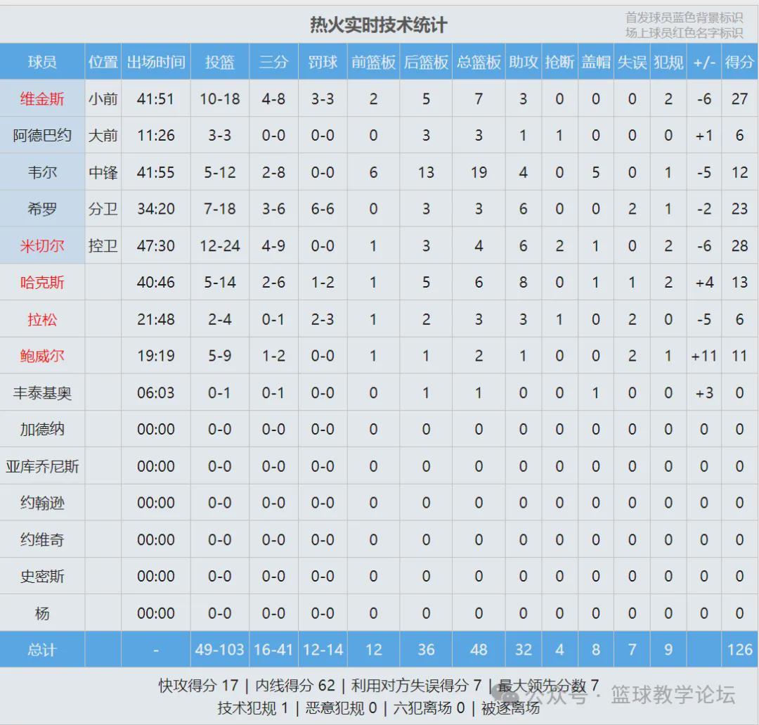 三球砍下30分5板10助、布里奇斯28分9板2助3帽、米勒23分4板6助2帽;小米切尔28分4板6助2断、维金斯27分7板3助、希罗23分3板6助。