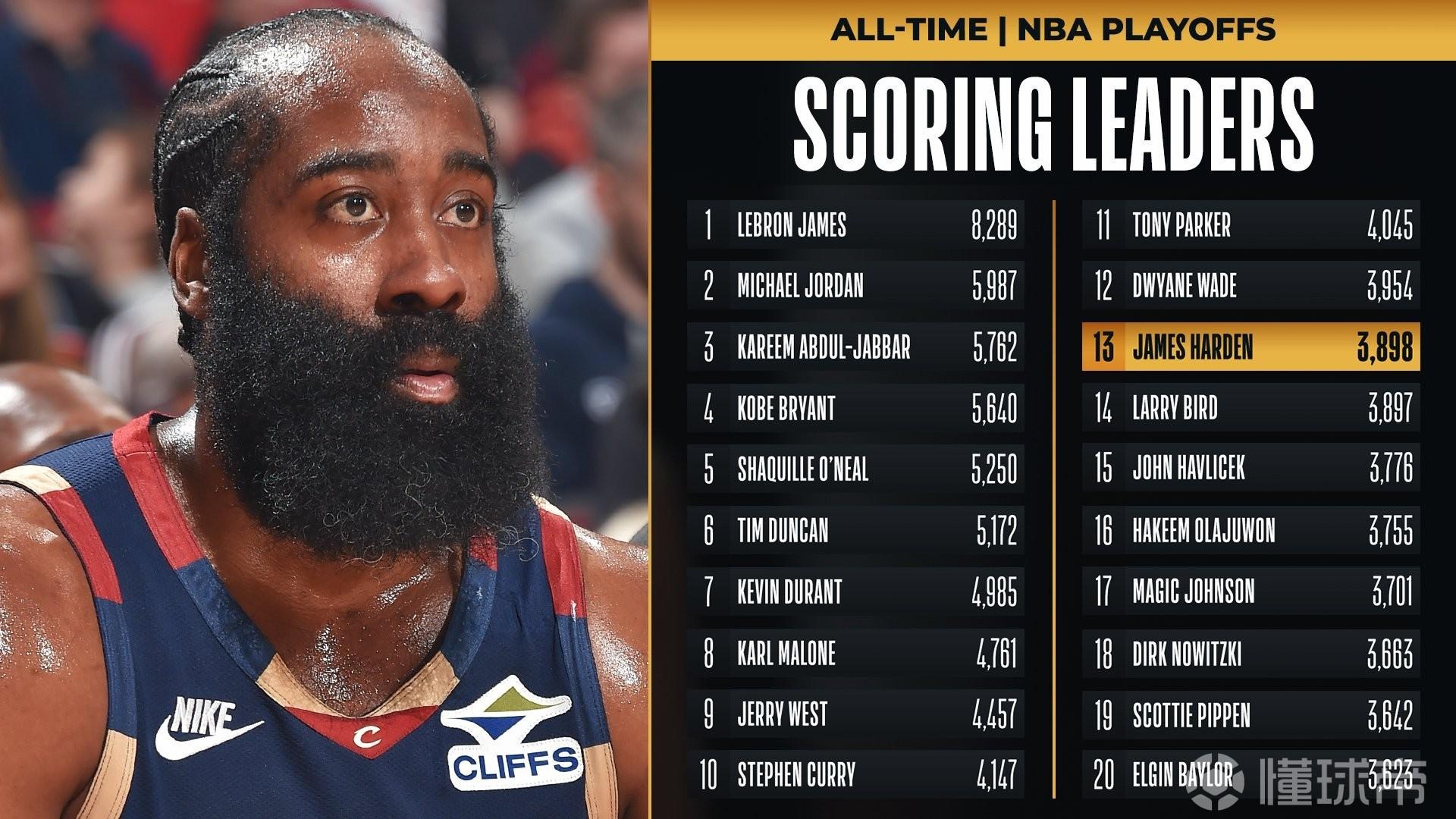 值得一提的是,哈登在季后赛历史得分榜上超越名宿拉里-伯德,升至历史第13位。