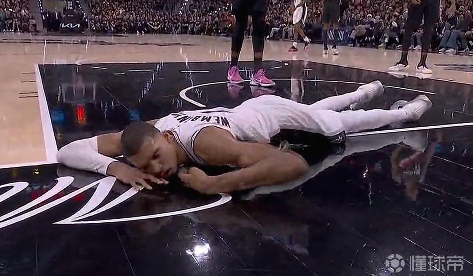 本场比赛第二节,文班亚马在突破时失去重心摔倒在地,随后退出比赛。