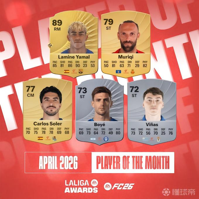 北京时间4月15日,西甲官方公布联赛4月最佳球员候选名单,这5名球员为亚马尔、穆里奇、索莱尔、博耶、比尼亚斯。
