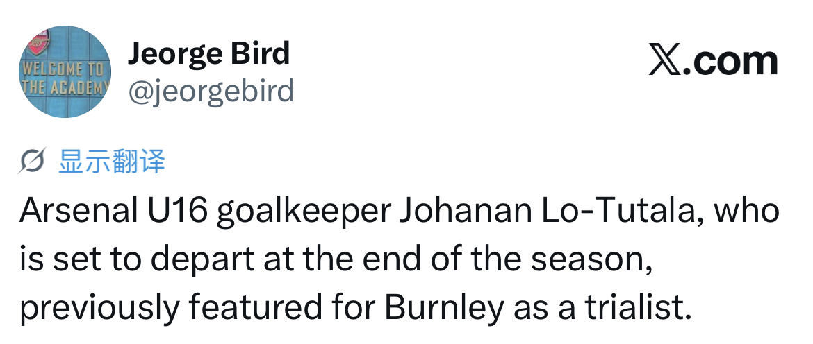 据阿森纳青训博主乔治-博德的消息,阿森纳16岁门将约阿南-洛-图塔拉前往英超另一支球队伯恩利试训并参加了比赛。
