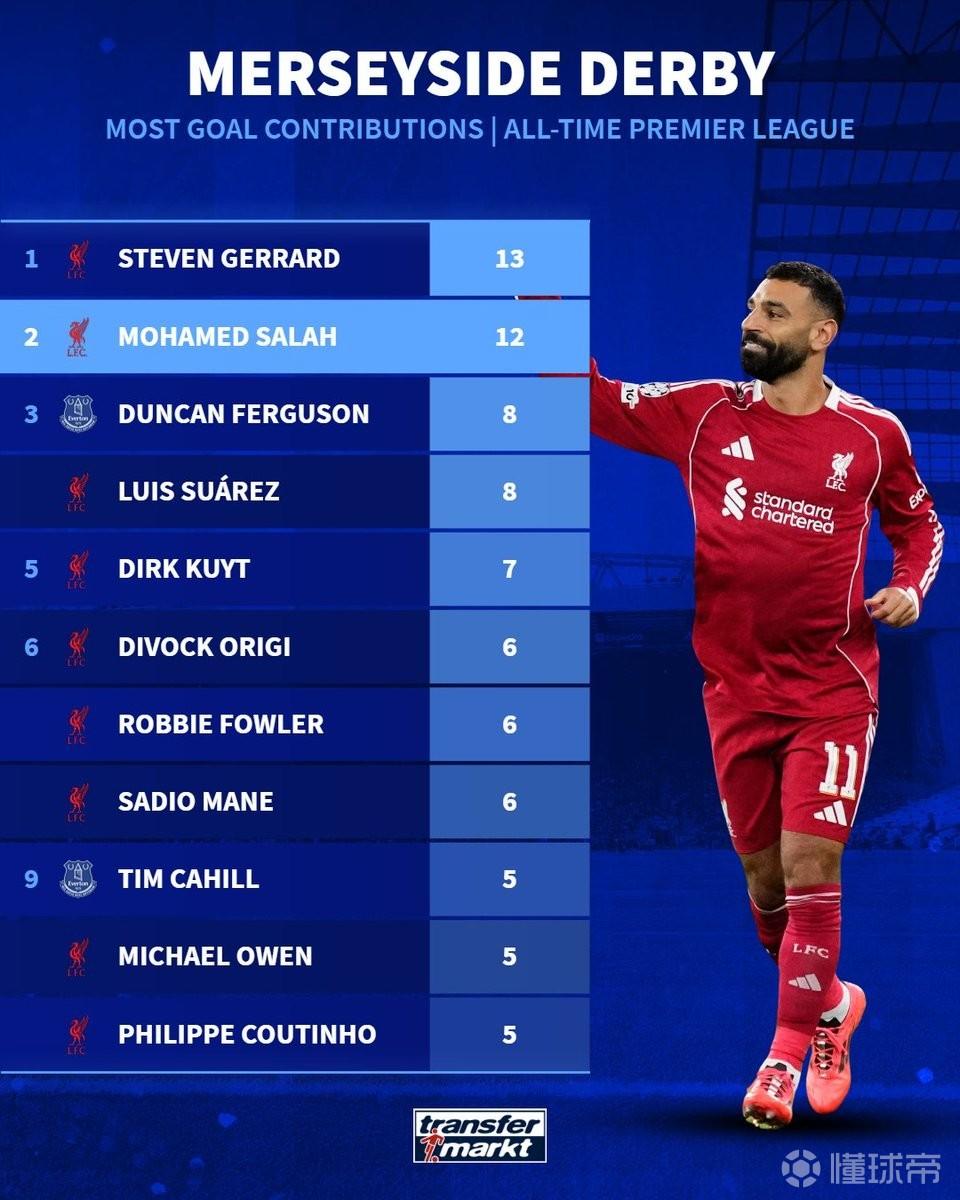 赛后德转列出了英超默西塞德德比历史上直接参与进球数最多的11名球员,萨拉赫以12球位列第二。