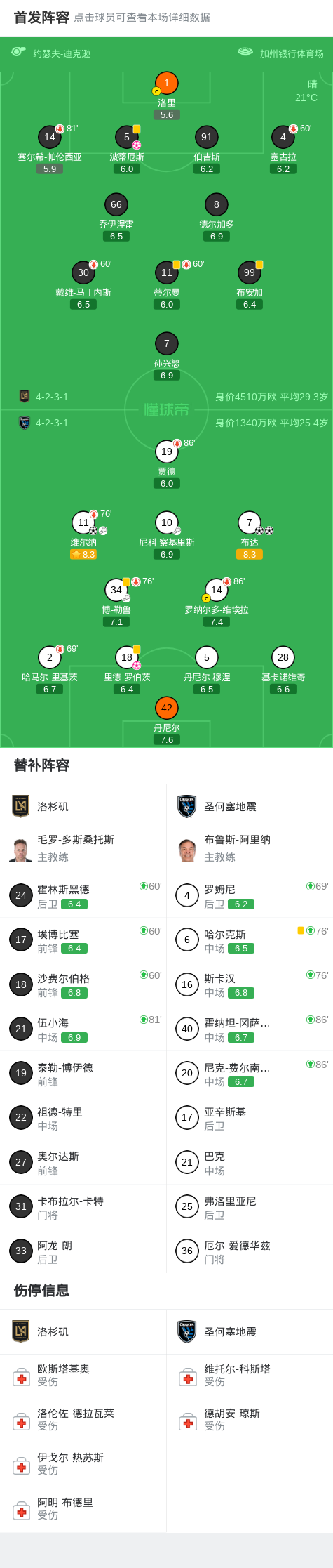 圣何塞地震4-1大胜洛杉矶取美职联4连胜,布达双响,维尔纳建功