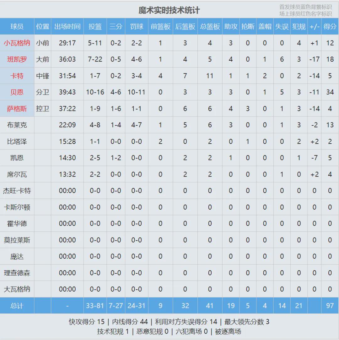 下半场开始,埃奇库姆连砍7分,76人一度拉开到11分,这场比赛首次出现两位数的分差。贝恩扛着魔术苦苦追分,前三节11中8轰下28分。再看看魔术其他四个首发:班凯罗17中6、萨格斯7中1、小瓦格纳6中1、小卡特也是6中1!