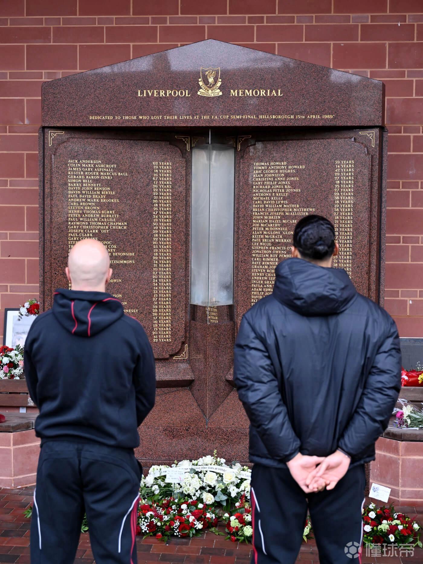 为表达哀思,利物浦一线队、女队以及U21、U18梯队的主教练和队长范戴克今日前往安菲尔德的希尔斯堡纪念碑献上花圈。俱乐部高层也参与其中,包括首席执行官比利-霍根、传奇球星达格利什爵士,以及俱乐部大使伊恩-拉什和娜塔莎-道伊。