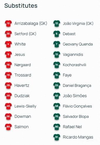 替补:13-凯帕、35-汤米-塞特福德、4-本-怀特、9-热苏斯、16-内尔高、29-哈弗茨、39-哈里森-杜齐亚克、49-刘易斯-斯凯利、56-道曼、89-马利-萨蒙